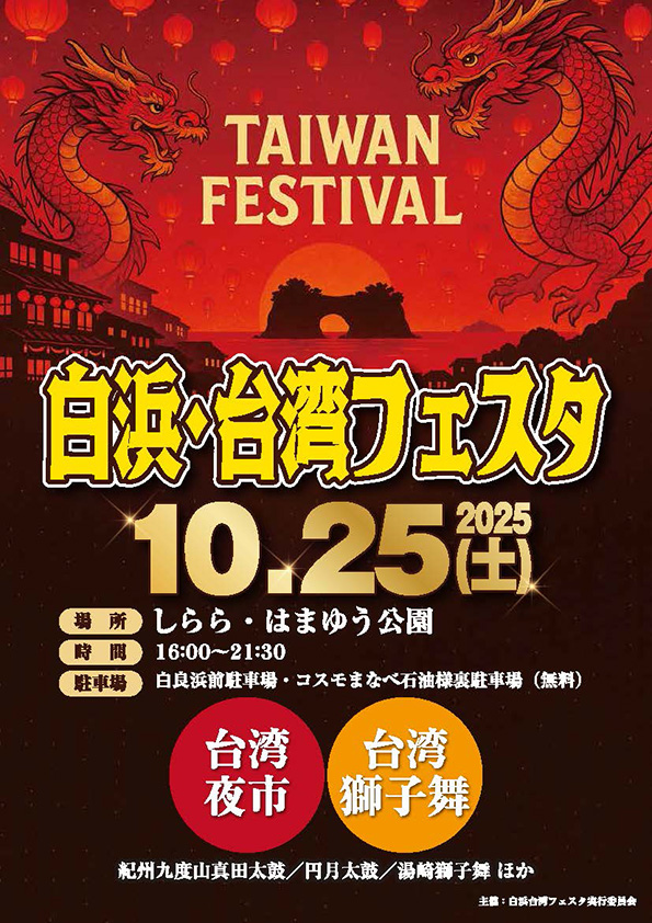 「白浜・台湾フェスタ」開催決定!2025年10月25日(土)白浜・しらら・はまゆう公園で初めて「白浜・台湾フェスタ」開催します。 台湾夜市、台湾獅子舞など、台湾を存分に楽しめるイベントです。是非、遊びにきてください! 台湾夜市(イメージ) 台湾獅子舞(イメージ) 日時:2025年10月25日(土) 時間:16:00~21:30 場所:しらら・はまゆう公園 (お問い合わせ先)電話番号:0739-43-5555 白浜・台湾フェスタ実行委員会事務局(白浜町総務課町長公室内) 地図 HOMEに戻る Posted by lancelotjp
