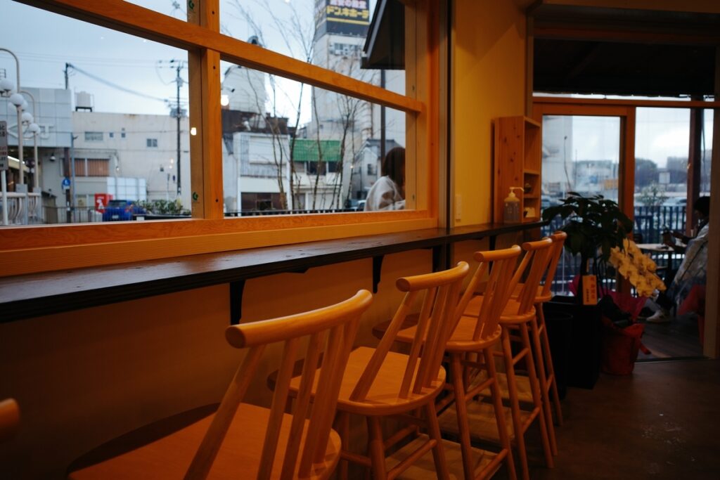 天井が高く、とても開放感があり、内装は木を基調とした、暖かみがある店内です。