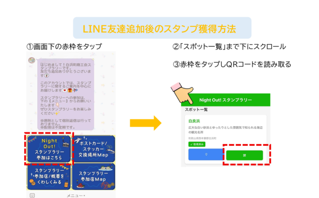 | 参加方法 | ※LINEアプリをダウンロードの上ご参加ください。 ①白浜町商工会LINE公式アカウントを「友だち追加」して「スタンプラリーへの参加」 (①~②・③の手順は下図をご覧ください) ②白良浜(護岸中央)に設置のQRコードを読み取りスタンプ獲得(※必須) ③参加店舗からあと2つスタンプ獲得 ④白良浜を含め3つスタンプがたまったら、記念品交換場所にてオリジナルポストカード&ステッカーをGET 〈記念品交換場所〉 ・まちなか総合案内所しらすな(※臨時休業あり) ・紀伊半島観光情報ステーション(JR白浜駅構内) ・Suntide Café&Bar Shirarahama(白良浜内) ⑤さらに、記念品お渡し時に配布するアンケートQRコードより、アンケートにご回答いただいた方の中から抽選で南紀白浜の豪華賞品が当たります! |
